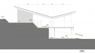 As premissas foram: aproveitamento da topografia, percepção visual da paisagem e separação definida dos usos. A partir disso, a edificação foi desenvolvida em três niveis de forma que não exista interferência entre as atividades realizadas. A orientação da edificação e acomodação na declividade do terreno juntamente com a criação de uma varanda com fachadas de vidro privilegiam a vista da barragem.